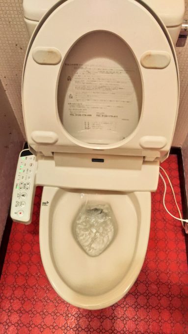 お客様が腰に付けた貼るホッカイロを落として流してしまった可能性があり、流す際に水位が上がる状態でした。