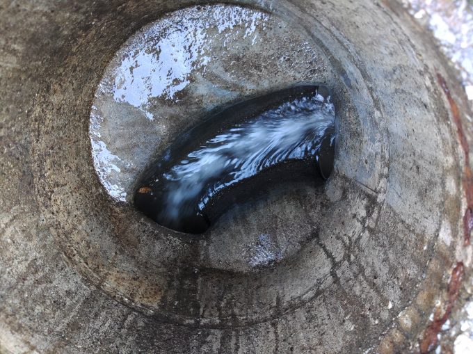 水の水圧で詰まっている汚水を引っ張ると、大量に汚水が流れていきました。