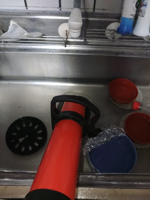ローポン器械を排水口にあて、引く押すを繰り返して、中で汚れ分解される事で詰まりが抜ける作業を行いました。