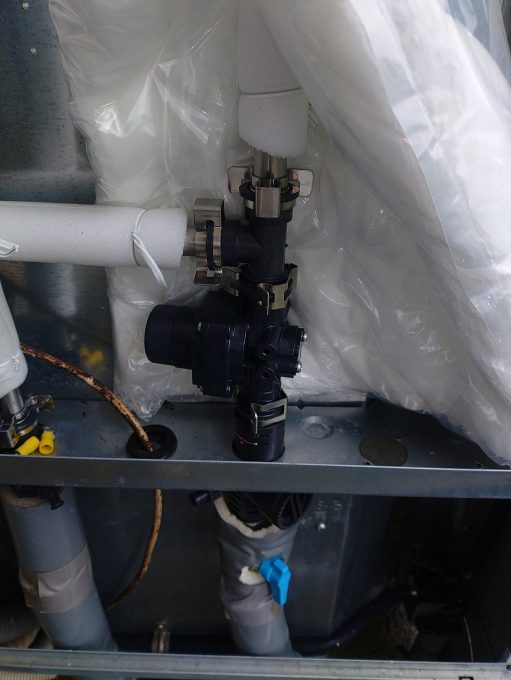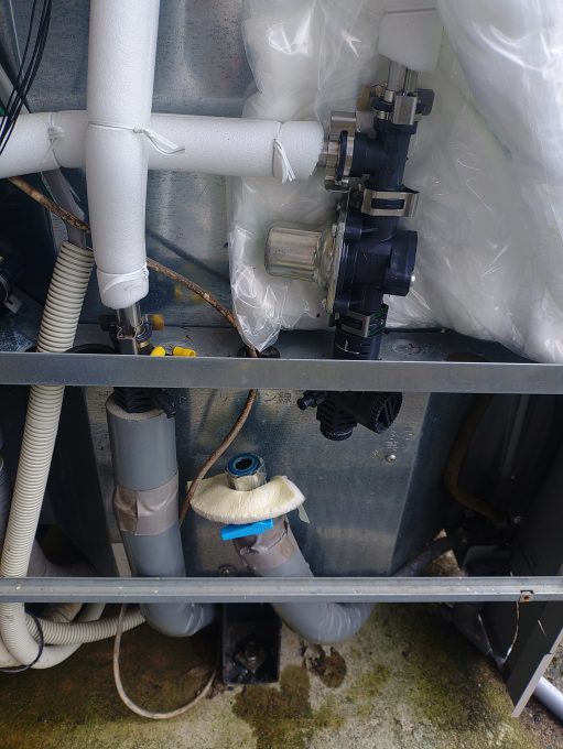 エコキュート本体の下から水がポタポタと落ちている状況でした。中を空けてみると部品が破損しておりました。